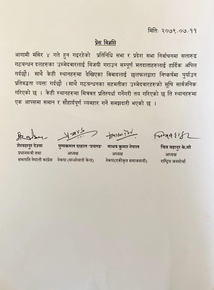 गठबन्धनमा रहेका चार दल नेपाली कांग्रेस, नेकपा माओवादी केन्द्र, नेकपा एकीकृत समाजवादी र राष्ट्रिय जनमोर्चाले विज्ञप्तिमा हस्ताक्षर गरेका छन् ।
