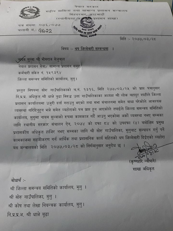 सोरु गाउँपालिकाबाट कार्य सम्पादन हुने सबै काम काजमा सहजिकरण गर्न आर्थिक तथा प्रशासनिक कार्य सहितको थप जिम्मेवारी दिईएको मन्त्रालयको मिति २०७७ ÷३ ÷२८ को निर्णय अनुसार खटाईए पनि जिम्मेवारी दिईएको पाँच घण्टा नबित्दै सत्ता र पहुँचको आधारमा फेरी गाउँपालिकामा कार्यरत विद्यालय निरिक्षक बिरेन्द्र मल्ल लाई नित्तिम प्रमुख प्रशासकिय अधिकृतमा सिफारिस गरेको छ