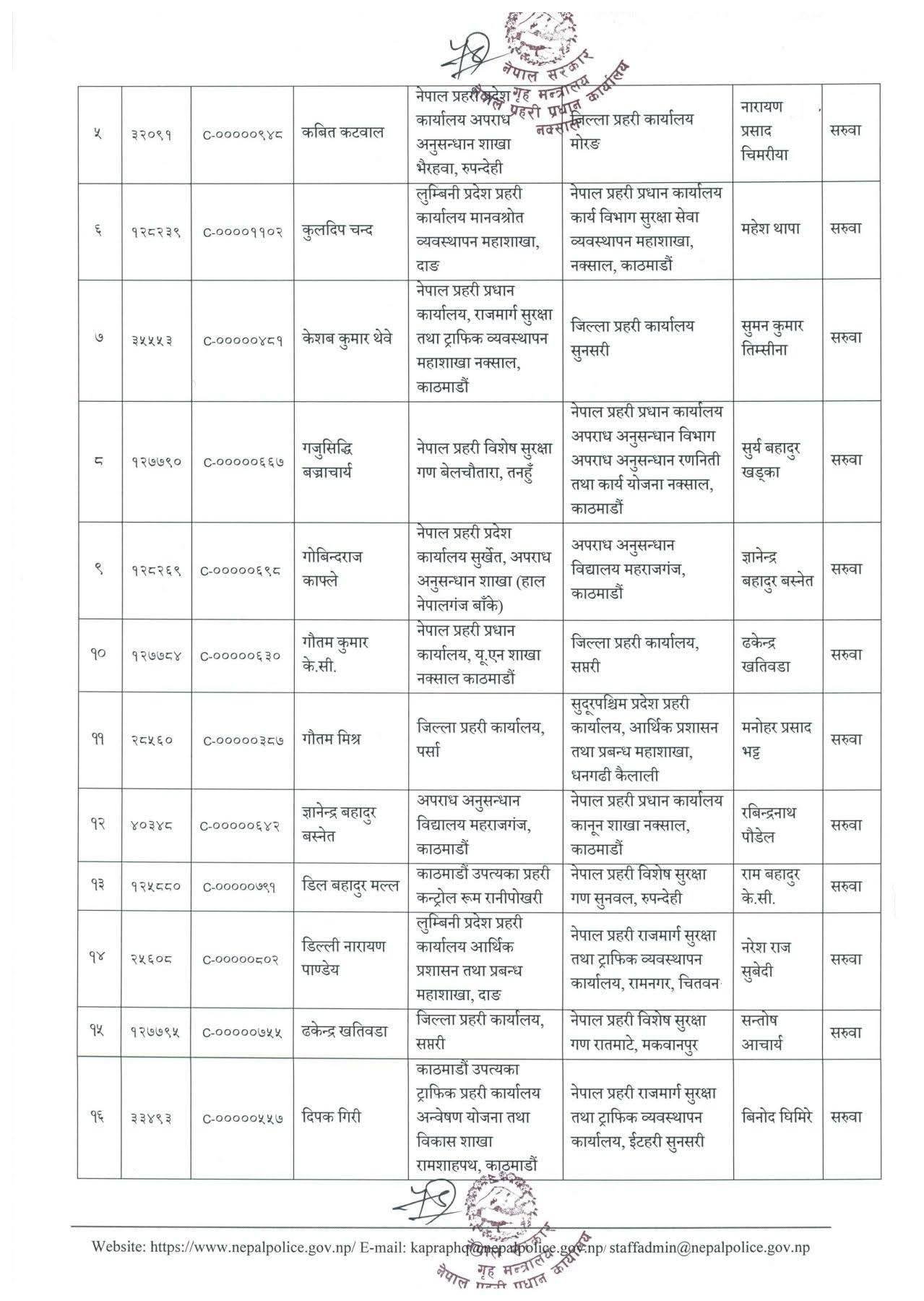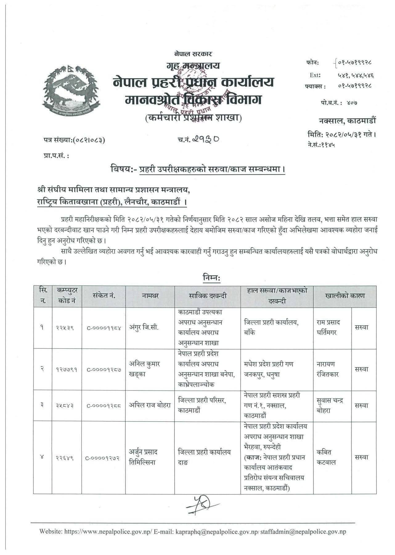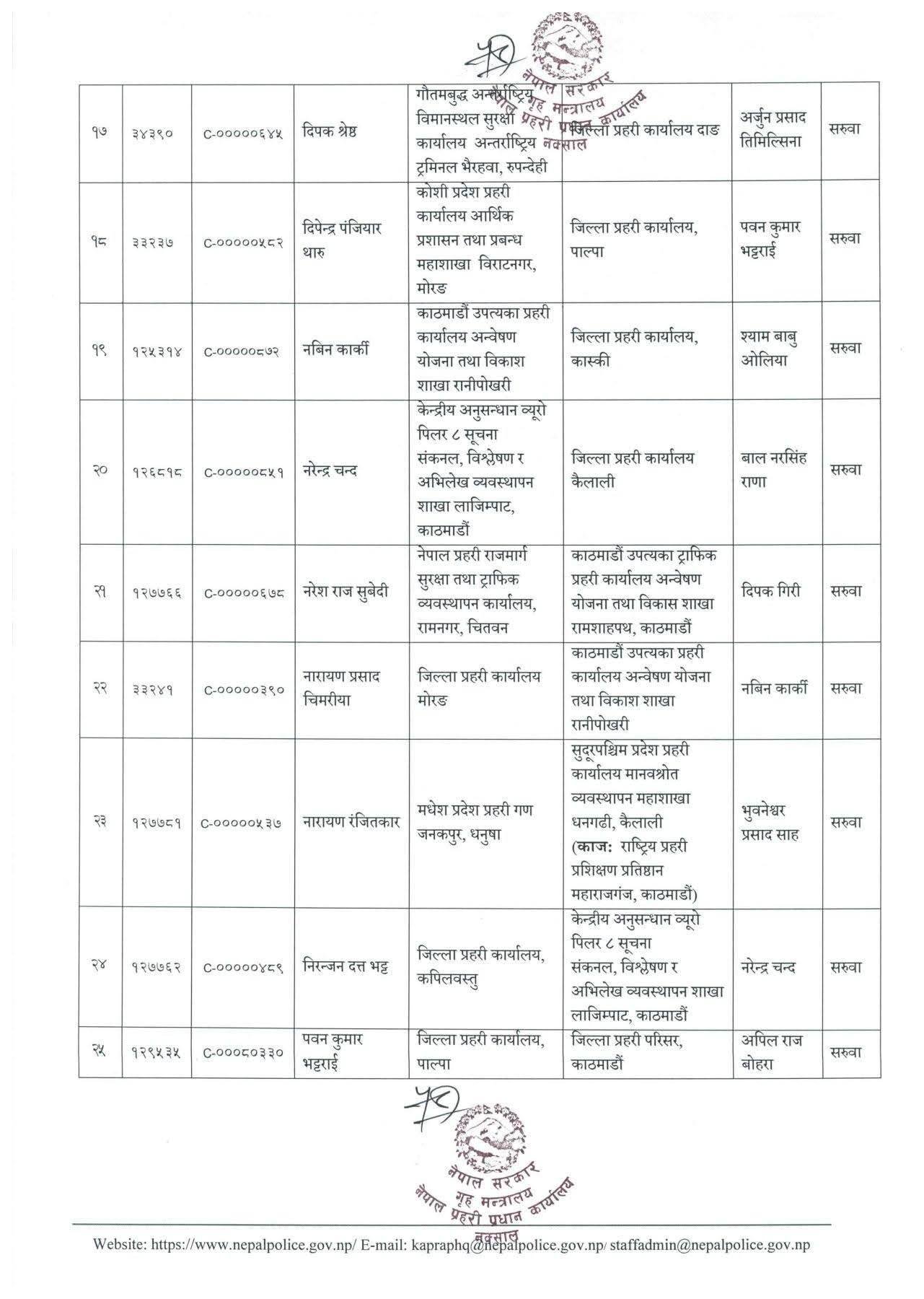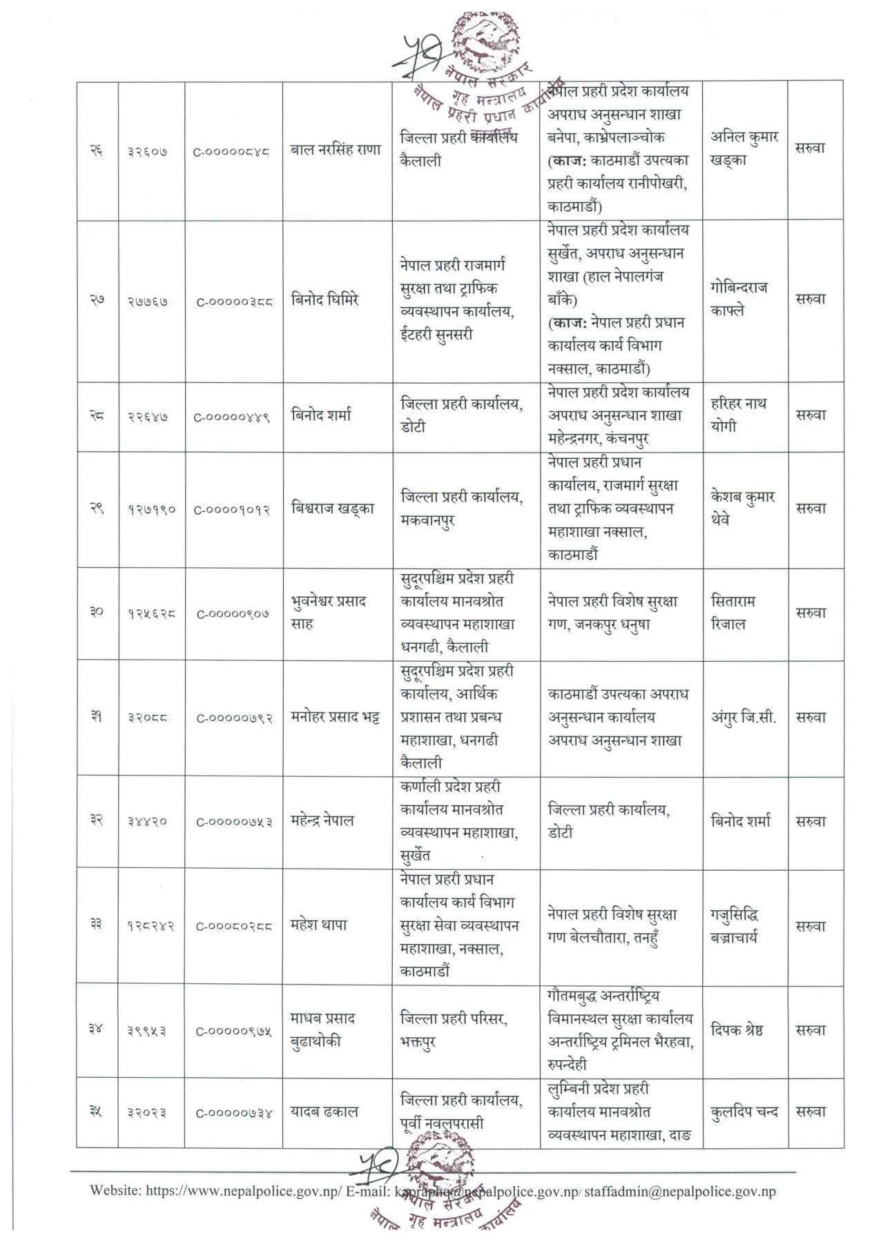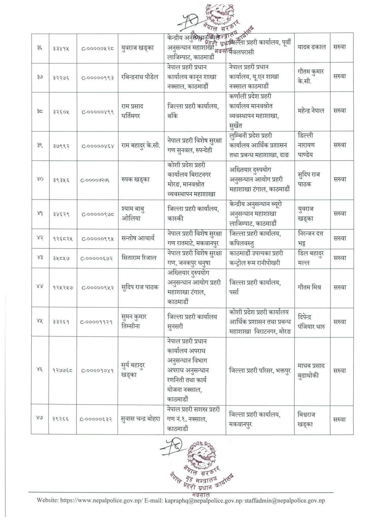 डोटीमा महेन्द्र नेपाललाई पठाइएको छ । पूर्वीनवलपरासीमा युवराज खड्का, पर्सामा सुदिप पाठक र भक्तपुरमा सूर्य बहादुर खड्कालाई पठाइएको छ । सुवासचन्द्र बोहरालाई मकवानपुरमा सरुवा गरिएको छ । प्रहरी महानिरीक्षकको भदौ ३१ को निर्णयअनुसार यो सरुवा गरिएको प्रहरी प्रधान कार्यालयले जनाएको छ ।