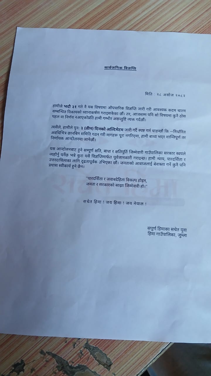 जुम्ला : हिमा गाउँपालिकाका सचेत युवाहरूले गाउँपालिकामा देखिएको अनियमितता, बेवास्ता र उत्तरदायित्वहीनता विरुद्ध आवाज उठाउँदै पुनः तीन दिनको अल्टिमेटम जारी गरेका छन्।