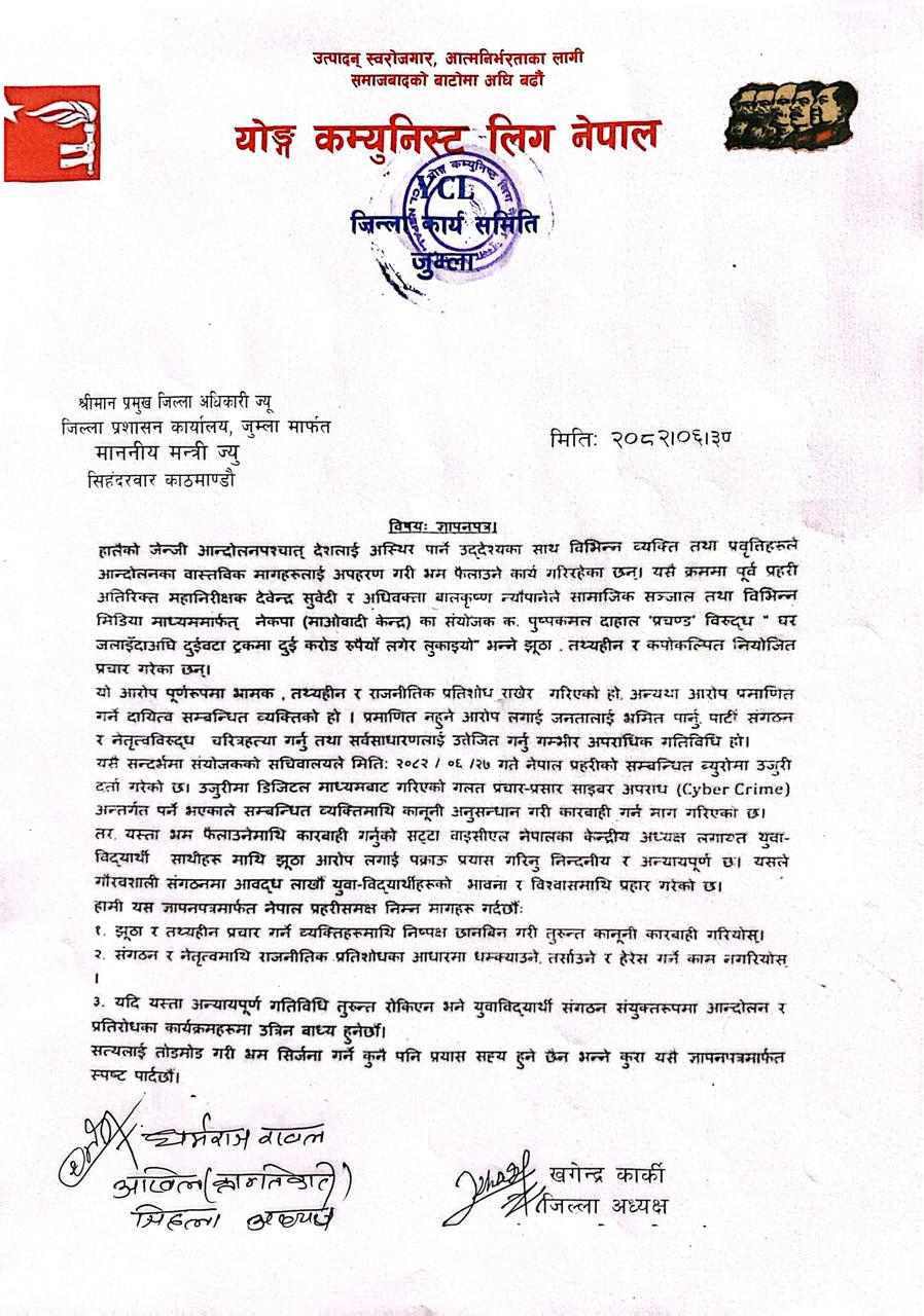जुम्लाबाट जिल्ला प्रशासन कार्यालय जुम्लाका प्रमुख जिल्ला अधिकारी केदार नाथ शरमा मार्फत सिंहदरबार गृह मन्त्रालय काठमाडौंमा रहेका माननीय मन्त्रीलाई सम्बाेधन गरिएकाे ज्ञापनपत्रमा भनिएकाेछ , हालैको जेन्जी आन्दोलनपछि नेकपा (माओवादी केन्द्र) का अध्यक्ष पुष्पकमल दाहाल ‘प्रचण्ड’ विरुद्ध गरिएको ‘घर जलाइदाअघि दुईवटा ट्रकमा दुई करोड रुपैयाँ लुकाइयो’ भन्ने आरोपलाई निराधार, तथ्यहीन र राजनीतिक प्रतिशोधपूर्ण भन्दै त्यसप्रति आपत्ति जनाइएको छ।