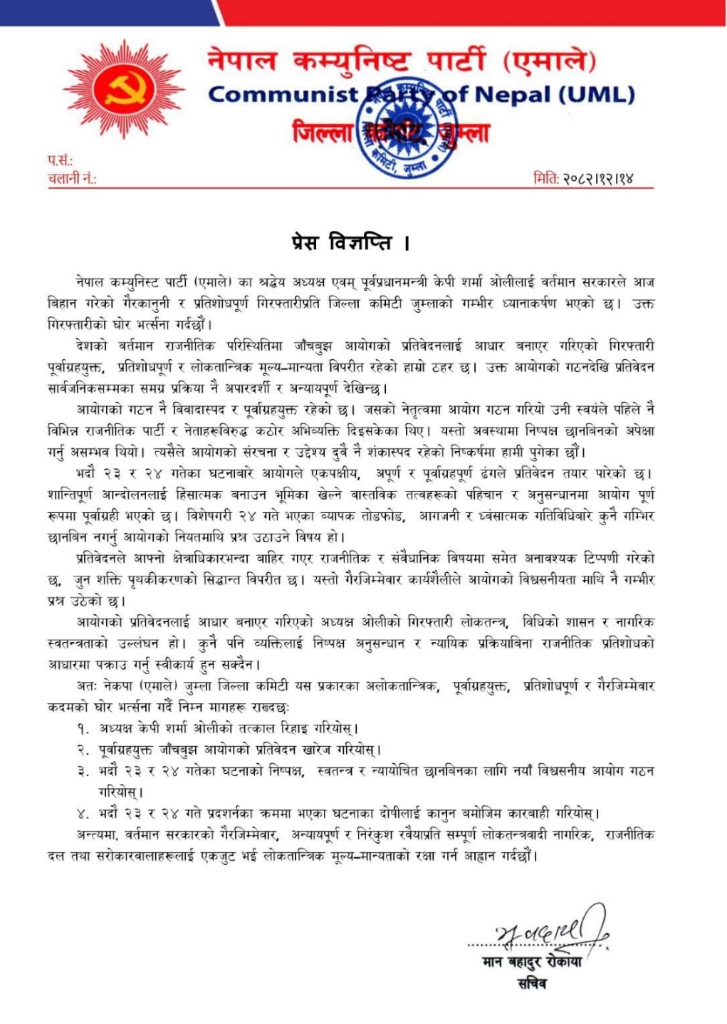 एमाले जुम्लाले अध्यक्ष ओलीको गिरफ्तारीलाई लोकतन्त्र, विधिको शासन तथा नागरिक स्वतन्त्रताको उल्लंघन भएको ठहर गर्दै तत्काल रिहाइको माग गरेको छ।