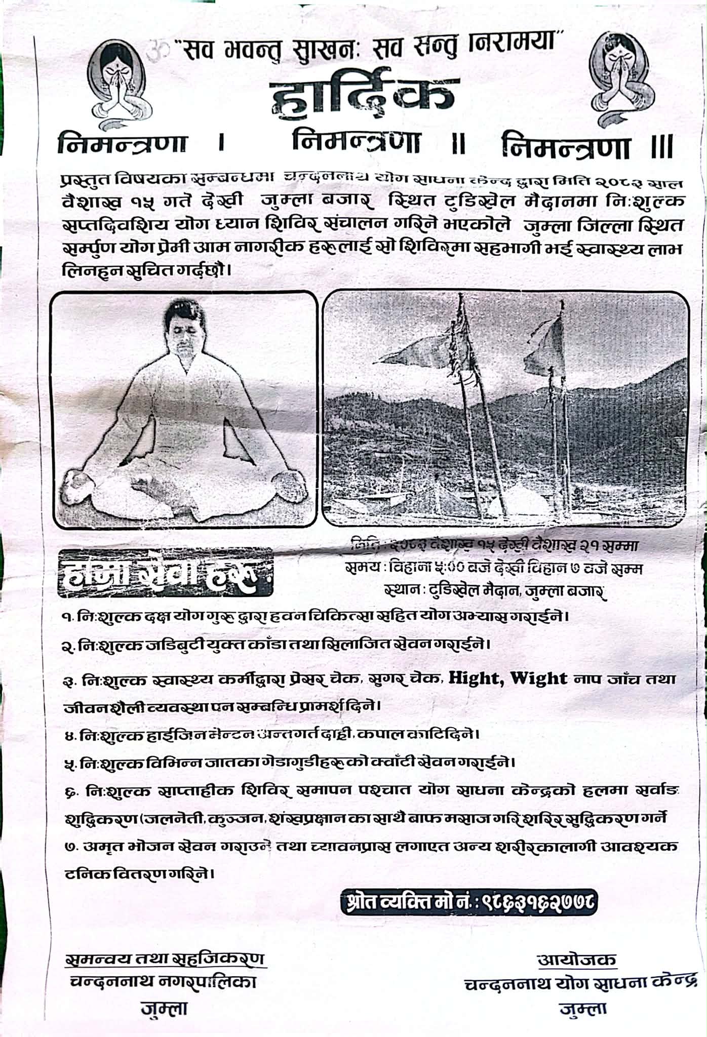 जुम्ला :चन्दननाथ योग साधना केन्द्र जुम्लाले आगामी वैशाख १५ गतेदेखि जुम्ला बजारस्थित टुडिखेल मैदानमा निःशुल्क सप्तदिवसीय योग तथा ध्यान शिविर सञ्चालन गर्ने भएको छ। स्वास्थ्य सचेतना अभिवृद्धि गर्ने उद्देश्यसहित आयोजना गर्न लागिएको उक्त शिविर वैशाख २१ गतेसम्म सञ्चालन हुने जनाइएको छ।